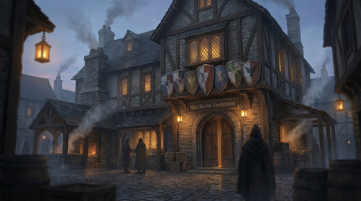 Use Nine Shields Smokehouse as table-usable context: concrete enough to support scene framing, but concise enough to keep play moving. Focus on what players can observe, infer, and act on without relying on unreached reveals. When revisited in recap or continuity checks, emphasize what changed, what resolved, and what still echoes forward.