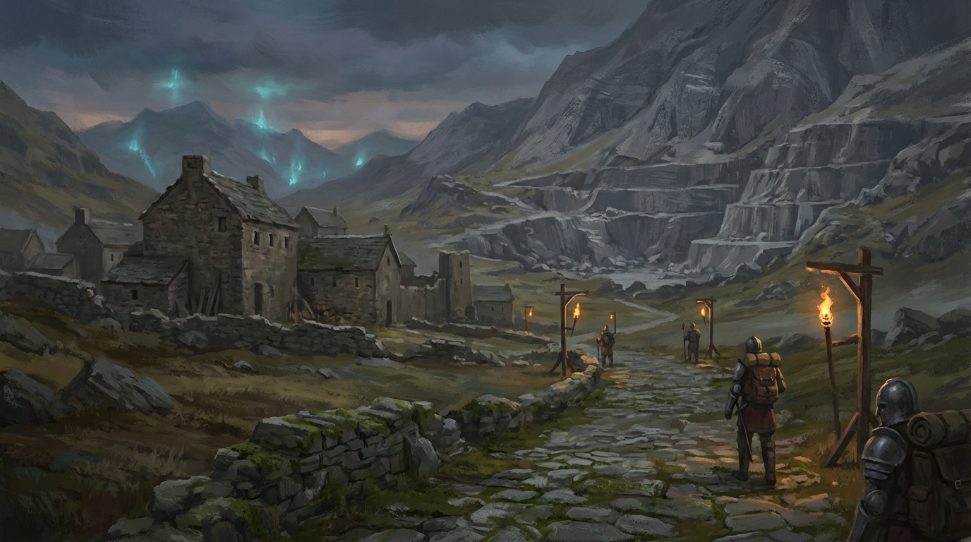 The location works best when presented as both inhabited and stressed. Civilians and workers still have routines, but those routines can be interrupted by supply disruption, rumor, or faction pressure linked to quarry operations. That gives the party useful social and tactical options without forcing immediate combat framing.